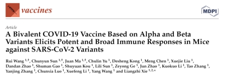 [3]Wang R, Sun C,Ma J, Yu C, Kong D, Chen M, Liu X, Zhao D, Gao S, Kou S, Sun L, Ge Z, Zhao J,Li K, Zhang T, Zhang Y, Luo C, Li X, Wang Y, Xie L. A Bivalent COVID-19 VaccineBased on Alpha and Beta Variants Elicits Potent and Broad Immune Responses inMice against SARS-CoV-2 Variants. Vaccines.2022; 10(5):702.