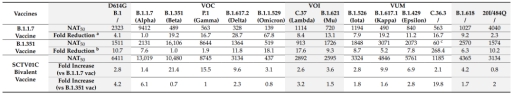 表1 接种2针单价疫苗(Alpha或Beta)或SCTV01C后,小鼠血清对14种主要变异株的中和抗体效价