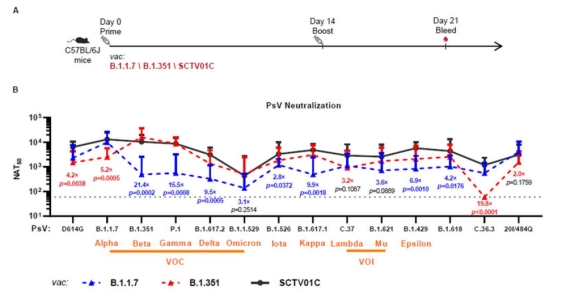 接种1针单价(Alpha或Beta变异株抗原)或二价疫苗SCTV01C(Alpha+Beta)28天后检测小鼠血清中中和抗体水平(抗体效价),单价Alpha疫苗和SCTV01C针对Alpha变异株的中和抗体水平相当;单价Beta疫苗和SCTV01C针对Beta变异株的中和抗体水平相当。但单价Beta疫苗针对Alpha变异株的中和抗体反应则非常弱,同样,单价Alpha疫苗针对Beta变异株的中和抗体反应也很微弱。上述结果初步展现出了二价疫苗SCTV01C优于单价苗的免疫原性优势 (图 1)。